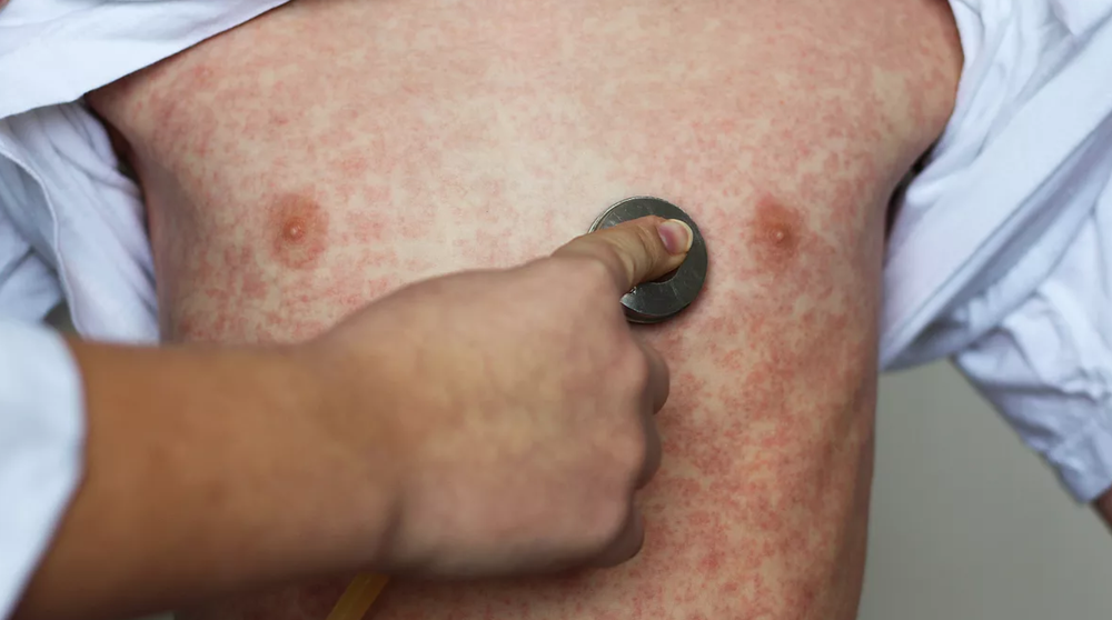 Đặc biệt, nhiều người bệnh đưa vào viện đã trong tình trạng biến chứng nặng. Cụ thể, mới đây, Trung tâm Bệnh Nhiệt đới tiếp nhận bệnh nhân nam N.V.A (38 tuổi), tiền sử khỏe mạnh sống ở TP. Thanh Hóa, bị sốt nóng liên tục 5 ngày, kèm theo đau họng, viêm đường hô hấp trên. Sau 3 ngày bệnh nhân nổi ban, lúc đầu ban mọc ở mặt sau lan ra toàn thân kèm ngứa ngáy khó chịu, những ngày sau đau bụng, đi ngoài phân lỏng 4-5 lần/ngày.