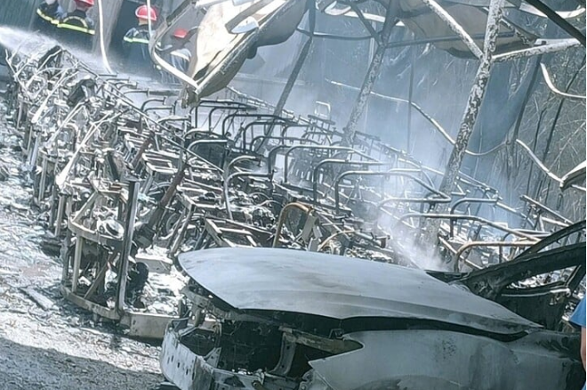 | Hiện trường đám cháy dàn xe điện du lịch ở khu du lịch chùa Hương Tích (Hà Tĩnh). (Ảnh: MXH) |