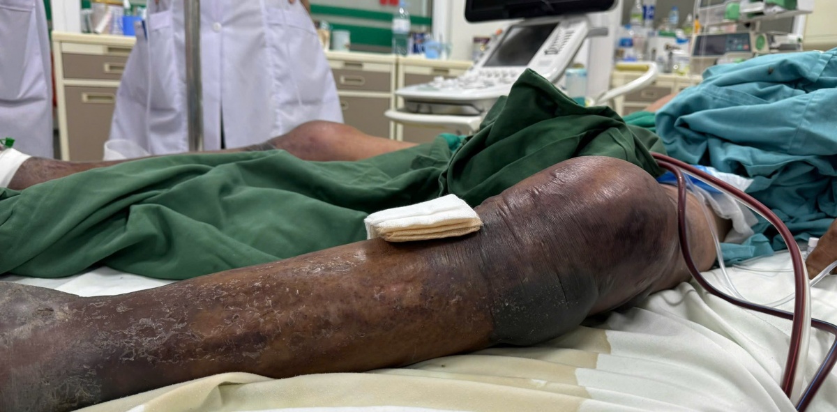 Hiện tại, toàn bộ chân trái bệnh nhân đã hoại tử lan rộng, chuyển sang màu tím đen sẫm – biểu hiện điển hình của hoại tử mô sâu. Cẳng chân phù to gần gấp rưỡi kích thước bình thường, căng cứng, bề mặt da biến dạng, bóng nhẫy, loang lổ những mảng màu tím – đen xen kẽ. Bàn chân tím bầm, các ngón cong vẹo, móng dày sừng, đổi màu đen sẫm do hoại tử kéo dài. Tổn thương lan nhanh với tốc độ đáng báo động: từ cổ chân, hoại tử lan dọc bắp chân, vượt qua gối và tiếp tục tiến lên vùng đùi chỉ trong vòng chưa đầy 24 giờ. Mức độ tiến triển có thể quan sát thấy rõ bằng mắt thường, thay đổi từng giờ. Ở chi còn lại, các mảng da sậm màu cũng đã xuất hiện và có xu hướng lan rộng – cảnh báo nguy cơ hoại tử toàn thân.
