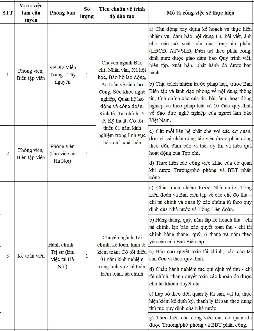 Căn cứ: Kế hoạch số 142A/KH-LĐCĐ ngày 29/3/2022 của Tạp chí Lao động và Công đoàn về việc tuyển dụng viên chức năm 2022; Công văn số 4631/TLĐ-ToC ngày 25/7/2022 của Tổng Liên đoàn Lao động Việt Nam về việc tuyển dụng viên chức năm 2022. Tạp chí Lao động và Công đoàn thông báo tuyển dụng viên chức năm 2022 như sau: